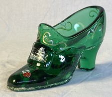Fenton Art Glass Hand Painted Christmas Ornaments On Emerald Green Shoe