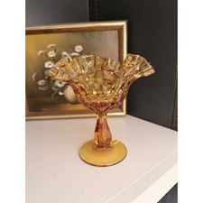 Vintage Fenton Amber Glass Ruffled Pedestal Compote Thumbprint Candy Dish