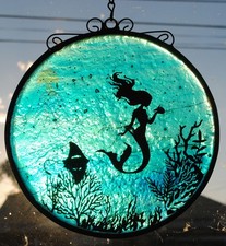Stained Glass Window Panel Mermaid coral stingray blue green irridized