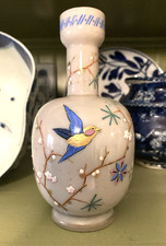 Antique Victorian Bristol Glass Vase Hand Painted Cherry Blossoms w/Blue Bird