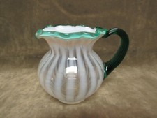 1990's Fenton Art Glass White Stripe Opalescent w/Green Crest & Reeded handle