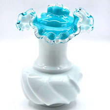 Fenton Art glass blue white slag cabbage rose bud vase original vintage label
