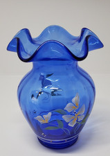 Vintage Hand Painted Blue Glass Fenton Ruffled Vase Signed By Artist