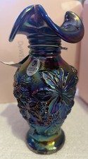 Rare Fenton Cobalt Blue Carnival Glass Wild Rose Iridescent Vase Aqua Crest Rim