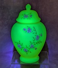 Fenton Custard Uranium Glass Temple Jar Ginger Flowers Hand Painted Signed GLOWS