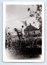 Old Vintage Photo MAN SMOKING TOBACCO PIPE GIRL STANDING ON LADDER SNAPSHOT