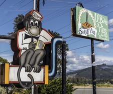 Curious advertising sign for the S&W Pies shop in Burlington, Washington, a