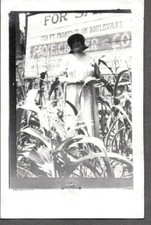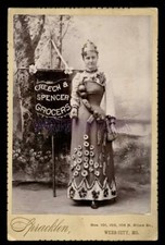 antique banner lady holding sign advertising a webb city missouri grocery store