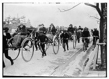 U.S. tourists in Tokyo. Shot of individuals being pulled in rickshaws.