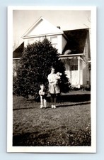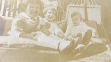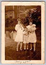 Vtg B&W Snapshot Three Children Girls Boy Holding Cat Teddy Bear House 1921