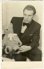 Little Boy with Teddy Bear 1940s Antique Toy Cute VINTAGE PHOTO ORIGINAL