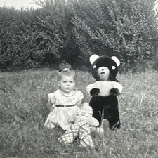 Vintage Black & White Photo Toddler with Giant Teddy Bear 1950s