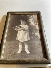 vintage 1930 Image little girl teddy bear and basket on lawn wood framed glass