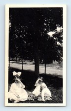 Old Vintage Photo PAIR GIRLS GRASS LAWN TOY STUFFED ANIMAL TEDDY BEAR BOW