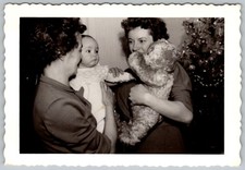 Vtg B&W Snapshot Women Holding Baby And Teddy Bear By Christmas Tree Tinsel