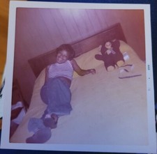 Vintage Found Photo 1976 African American Girl in Jeans Posing on Bed with Bear