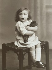 ANTIQUE PHOTO CUTE LITTLE GIRL SAT HUGGING HER TEDDY BEAR FASHION DRESS