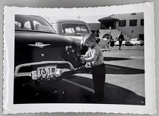 Cute Boy Puts Teddy Bear on Classic Car Bumper Vintage Snapshot Photo