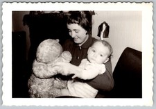 Vtg B&W Snapshot Woman Holding Baby Reaching For Large Teddy Bear Toy Interior