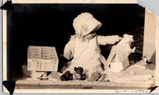 Vintage 1922 Snapshot Photo Baby Opening Gift Bonnet Teddy Bear Childhood