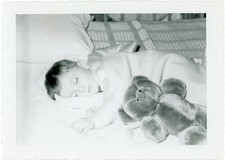 Old Vintage Photo SLEEPING BABY WITH TOY TEDDY BEAR STUFFED ANIMAL FOUND PIC