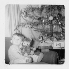 1950s Boy Stuffed Plush Teddy Bear by Christmas Tree Childhood Holiday