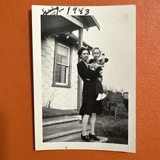 Vtg B&W Snapshot Woman & Child With Teddy Bear Sitting On Porch Steps 1920s
