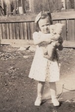 Portrait Girl Holding Toy Teddy Bear Stuffed Plush Backyard 1940s
