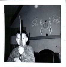 Vintage 1950s Black & White Photo Boy Holding Toy Gun Retro Living Room