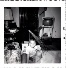 Vtg 1965 Black & White Photo Boy w/ Toy Crane & TV Living Room Snapshot