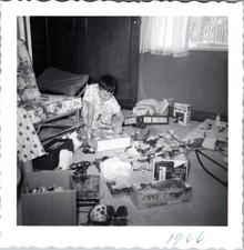 Vintage 1966 Black & White Photo Boy Opening Gifts Christmas Birthday Toys