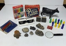 Vintage Junk Drawer Toy Lot 60’s 70’s Chalk Crayons Dice Plastic Rocks Figures +