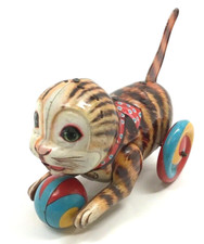 Vintage Cat holding a Ball Tin Litho Tail Wind Toy Made in Japan So cute!