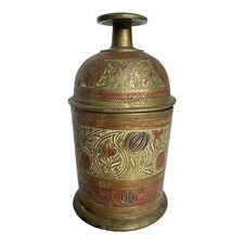Vintage 5.5” Brass Urn Pot Storage Antique Jar Lid Engraved India Etched Red Cup