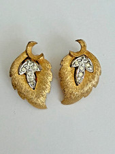 Vintage Gold Leaf Rhinestone Clip Earrings Mid Century Hollywood Regency