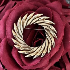 Mid Century Gold Tone Laurel Wreath Open Circle Layered 2” Textured Brooch Pin