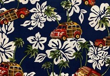 Hawaiian Print Fabric - Antique Car, Hibiscuses, and Palm Trees - 43” wide