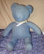 VINTAGE RETRO COTTAGE CHIC BLUE JEAN DENIM STUFFED TOY BEAR BIG 20 INCHES TALL