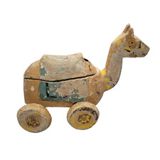 Vintage Hand Carved Painted Wooden Primitive Camel Figurine Wheels Toy Stash Box