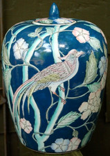 WBI Chinese GINGER JAR URN W LID Hand Painted Porcelain EXOTIC BIRD Blue Pink LG