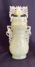 Carved Light Green Jade Lidded Vase Urn Ring Handles Chinese Style Vintage 9 In