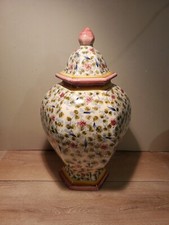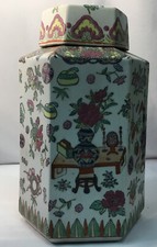 Vintage Asian Famille Hexagon Shaped Tall Lidded Vessel Urn Handpainted