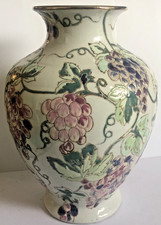 Vtg Chinese Chinoiserie Mantle Urn Vase Grape Vine 9.5" Enameled Porcelain White