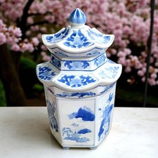 Asian Urn Jar w/ Lid - Hexagon - Floral w/ Gold Gilt - Hand Painted - 10.5”