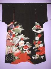 Antique Black Tomesode Silk Crane and gold pine pattern Black 61.3inch Women's