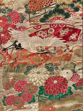 Antique Japanese Maru Obi Cranes Flowers Pattern Gold Thread