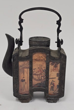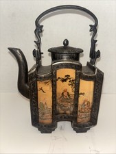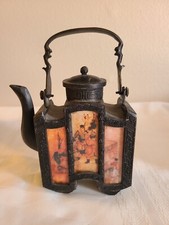 Antique Chinese Metal Decorative Teapot With Six Reverse Painted Glass Panels