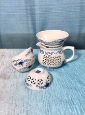 Tea Pot With 4 Cups. Japan Blue Brown White Home Decor Glass Porcelain Vintage