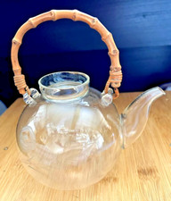Vintage Handblown Glass etched cut Bamboo Handle 2 Cup Teapot Japan NOS