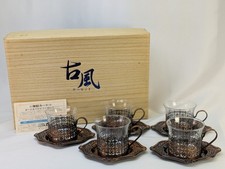 Antique Teacup Set with Glass and Metal Coasters, Japanese Style